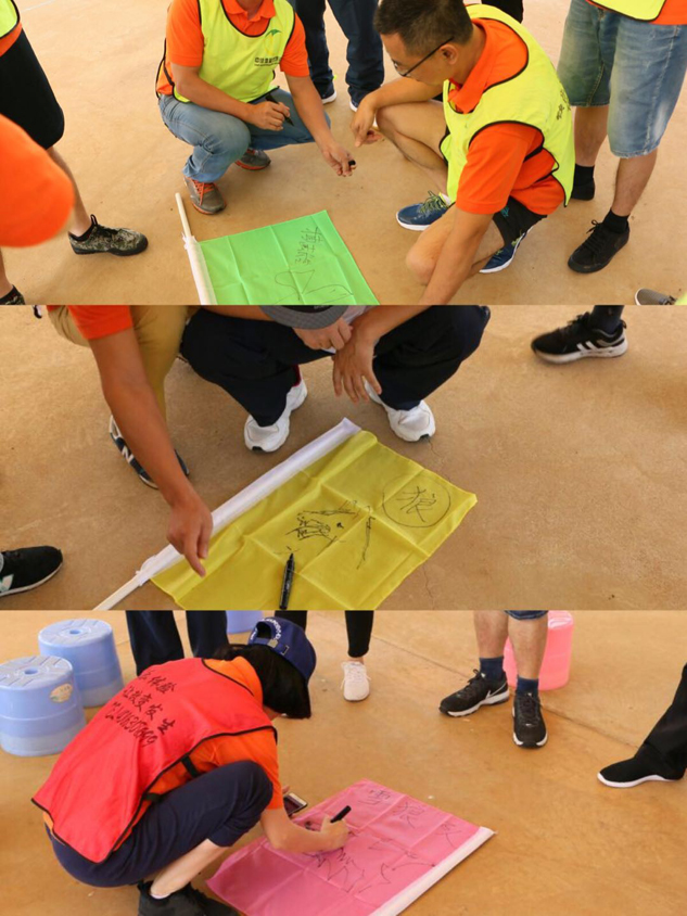 本次活动得到了公司领导的高度重视和广大中高层管理干部的积极参与。8月4日早7:30迎着和煦的朝阳,尊龙凯时管理团队踏上了拓展训练的征程。抵达拓展基地后按照教练团队的要求迅速完成分组和热身,经由全体队员讨论产生队名和口号,并选举队长、队秘和旗手,三支代表队分别为“雪狼队”队长冯雪玉、“战狼队”蔡宏、“雄鹰队”李党,从队名的气势上也能让我们感受到他们完成拓展任务的决心和勇气!▲团队展示